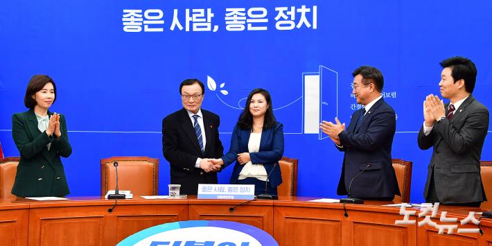 더불어민주당 이해찬 대표가 16일 오전 국회에서 열린 인재영입 환영식에서 영입인재 9호 글로벌 이코노미스트 최지은 박사와 인사를 하고 있다.