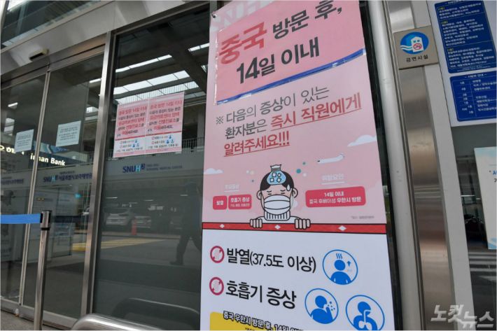 설 연휴 마지막 날인 27일 서울 동작구 보라매병원 출입구에 신종 코로나바이러스(우한 폐렴) 관련 안내문이 붙어 있다. 박종민기자