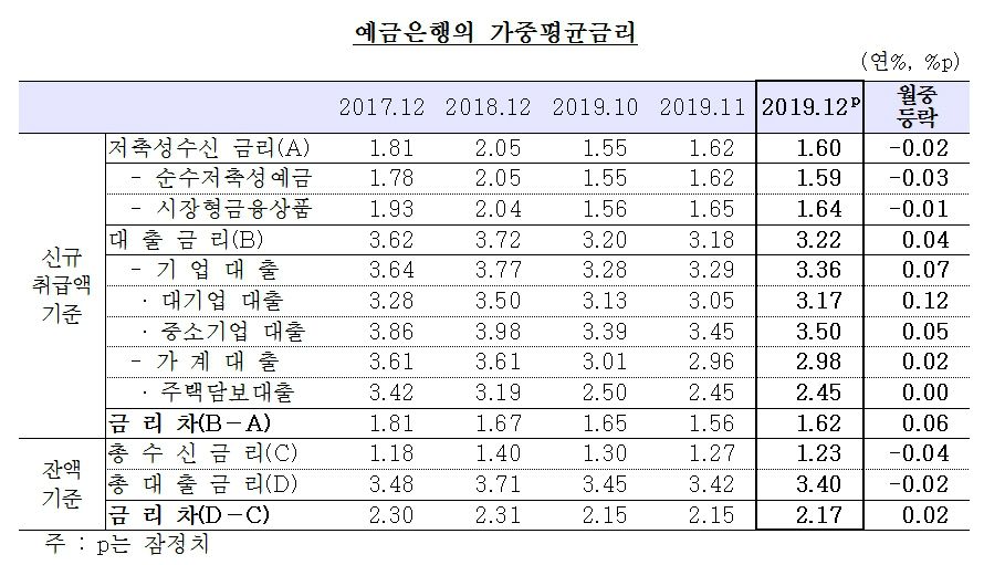 30일 한국은행 '2019년 12월중 금융기관 가중평균금리'에 따르면 지난달 은행권의 신규취급액 기준 가계대출 금리는 한 달 전에 비해 0.02%포인트 상승한 연 2.98%로 나타났다.