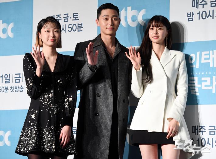 배우 김다미(왼쪽부터), 박서준, 권나라가 30일 서울 영등포구 콘래드호텔에서 열린 JTBC 금토드라마 ‘이태원 클라쓰’ 제작발표회에 참석해 포즈를 취하고 있다.