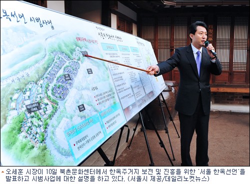 ◈ ''서울 한옥선언'' 발표…10년간 4대문 안팎 4500채 보전 서울시는 10일 한옥 밀집 지역을 가장 서울다운 정취가 있는 주거지로 만들기 위해 ''서울 한옥선언''을 발표했다. 앞으로 10년동안 4대문 안팎의 한옥 4500동이 서울시 관리를 받게 된다.