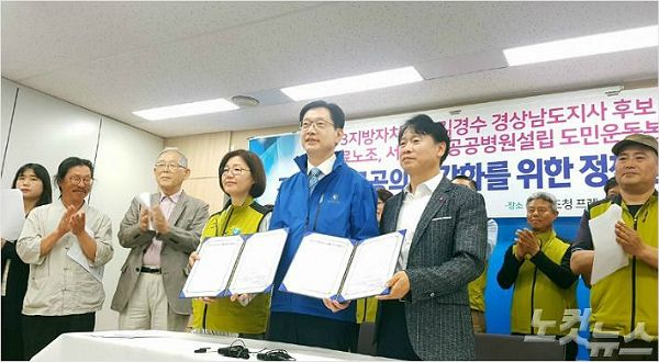 김경수 경남지사가 도지사 후보 시절인 지난 2018년 5월 보건의료노조, 서부경남 공공병원설립 도민운동본부와 서부경남 혁신형 공공병원 설립 등을 담은 정책 협약을 맺었다.(사진=자료사진/최호영 기자)