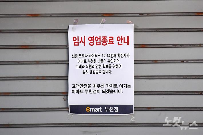 3일 오전 신종 코로나 확진자가 다녀간 것으로 확인된 경기도 부천시 심곡본동 이마트 부천점에 임시 영업종료 안내문이 붙어 있다.