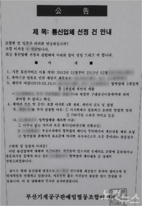 조합 측은 이사회 표결로 A 업체를 선정했기 때문에 절차상 문제가 없으며, 통신회선 관리 문제와 가격 등을 종합해 내린 결정이라는 입장이다.