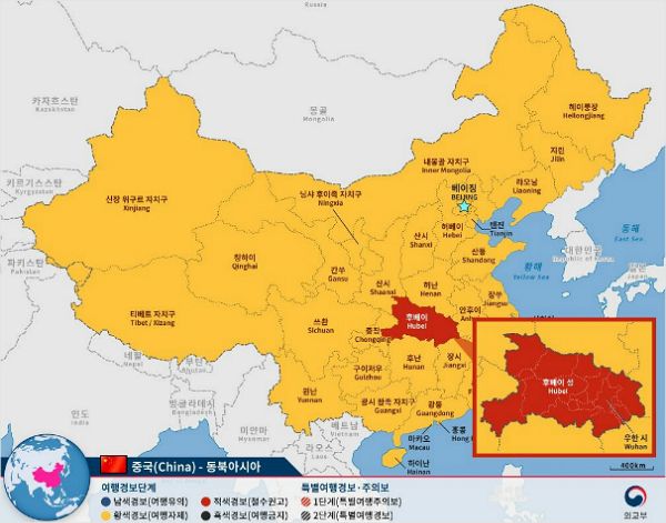 3일 오후 현재 중국 여행경보. 후베이성을 제외하고는 '여행자제' 경보만 내려져 있다.(사진=외교부 홈페이지 캡처)