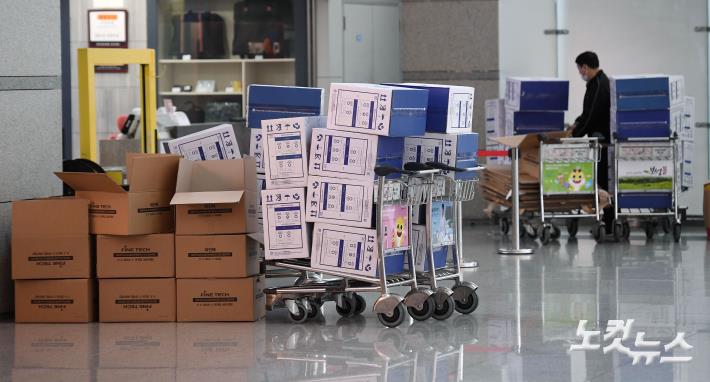 신종 코로나바이러스 감염증에 대한 확산 우려가 이어진 4일 인천국제공항 1터미널 출국장에 중국으로 보내질 마스크 박스들이 가득 쌓여 있다.