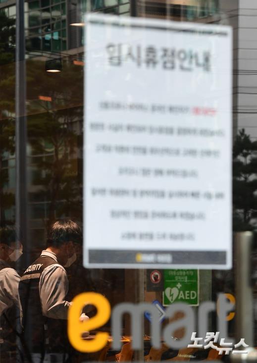 7일 오후 신종 코로나바이러스 감염증 23번 확진자의 방문이 확인돼 임시휴점에 돌입한 서울 신공덕동 이마트 마포점에서 이마트 관계자들이 카트 소독작업을 하고 있다.