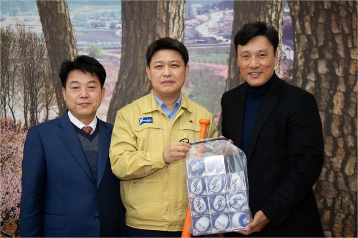 이승엽 베스트웨스턴 홍보대사와 손연호 회장, 이희진 영덕군수가 기념사진을 찍고 있다.(사진=영덕군 제공)