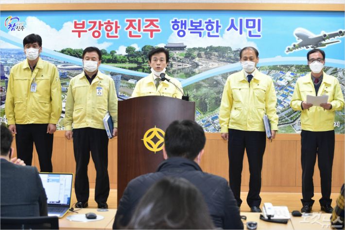 조규일 진주시장이 21일 코로나19 확진자 발생과 관련한 긴급 기자회견을 하고 있다. (사진=진주시 제공)