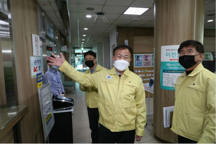 이재수 춘천시장이 지난 20일 춘천시 보건소에 설치된 선별진료소를 방문해 코로나19 대응 상황을 점검하고 있다.(사진=춘천시 제공)