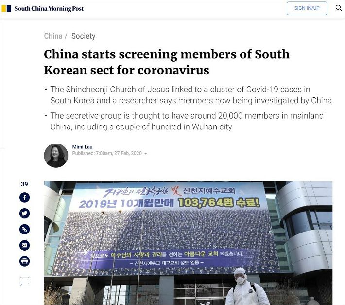 홍콩 사우스차이나모닝포스트(SCMP)는 27일 신천지를 밀접하게 추적한 연구원의 말을 인용해 중국 당국이 한국을 방문한 몇몇 사람들을 조사했는데 이들은 신천지 두 그룹과 연관되어 있다고 보도했다.