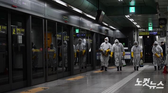코로나19 확진자가 2천명을 넘어선 28일 오후 서울교통공사 관계자들이 광화문역에서 방역작업을 하고 있다.