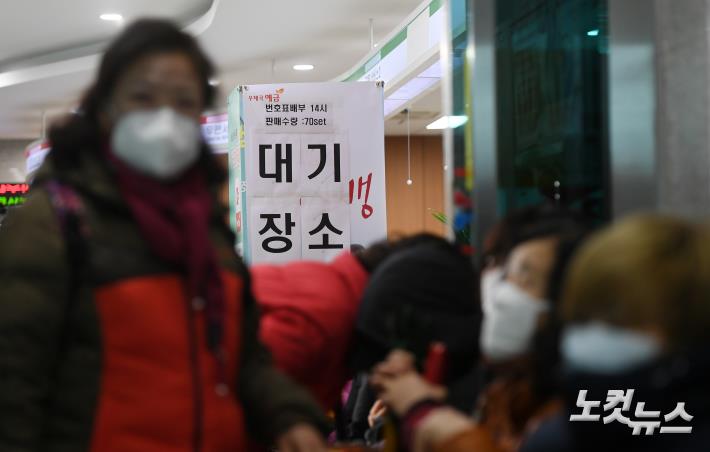 전국 읍·면 우체국에서 마스크 판매를 시작한 28일 오후 경기 파주시 문산우체국에서 시민들이 마스크를 구입을 위해 줄 지어 있다.