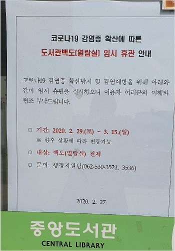 전남대학교 ‘코로나 19’ 비상대책위원회(위원장 정병석 총장)는 학생 및 일반인 열람실과 그룹스터디 룸 등 모두 2천 9백석을 갖춘 중앙도서관 별관(일명 백도)을 오는 29일부터 개강 직전인 오는 3월 15일까지 임시 휴관하기로 했다. 중앙도서관 본관(일명 홍도)도 이 기간 대출업무만 수행하고 출입은 통제하기로 했다.