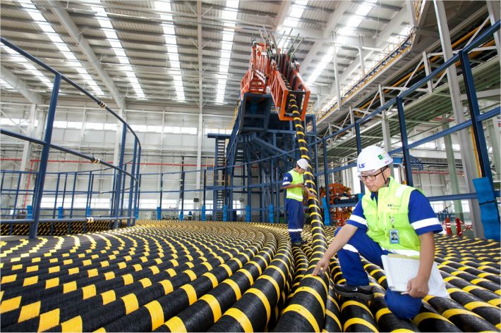 LS전선 강원도 동해시 해저 케이블 공장에서 직원들이 생산 제품을 점검하고 있다.(=LS전선 제공)