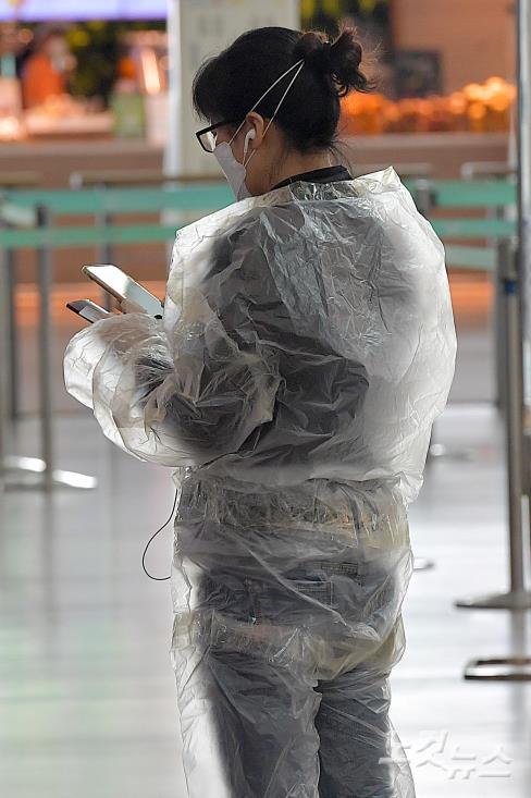 코로나19의 영향으로 한국인의 입국 제한 또는 금지하는 나라가 늘어가고 있는 가운데 3일 인천국제공항에서 비닐로 만든 방호복을 입은 여행객이 탑승 수속을 밟고 있다.