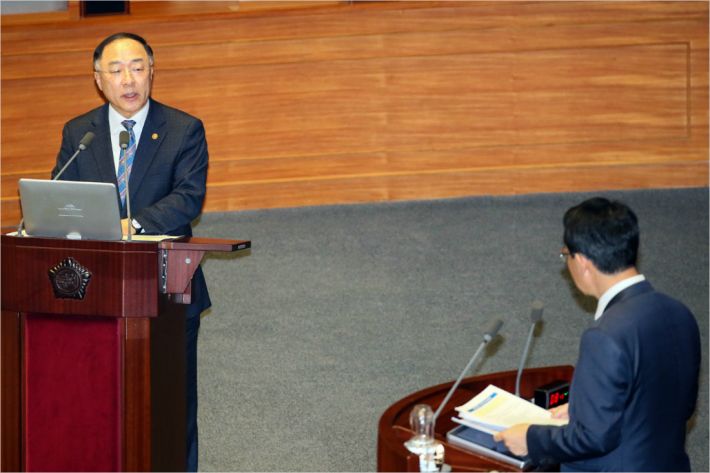 홍남기 경제부총리가 3일 국회 본회의에서 진행된 경제분야 대질문에서 답변하고 있다.(사진=연합뉴스)
