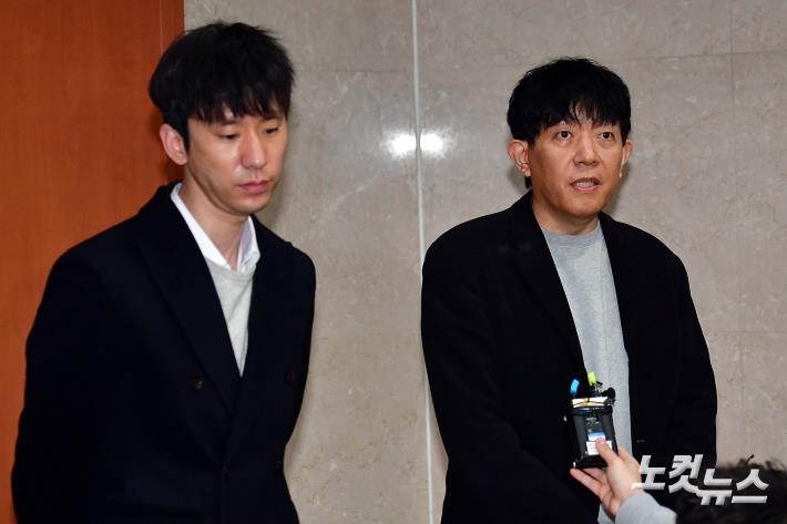이재웅(우측) 쏘카 대표와 타다 운영사 VCNC 박재욱 대표가 일명 타다 금지법으로 불리는 여객자동차운수사업법 개정안의 법사위 심의를 앞두고 3일 오후 국회 정론관 앞에서 개정안 반대 입장을 밝히고 있다.