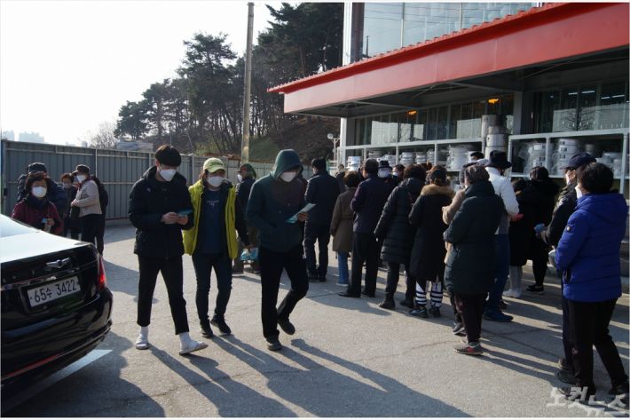 3일 오전 강원 강릉시 한국주방산업 매장 앞에 마련된 마스크 무료 나눔 행사에 시민들의 행렬이 이어졌다. (사진=전영래 기자)