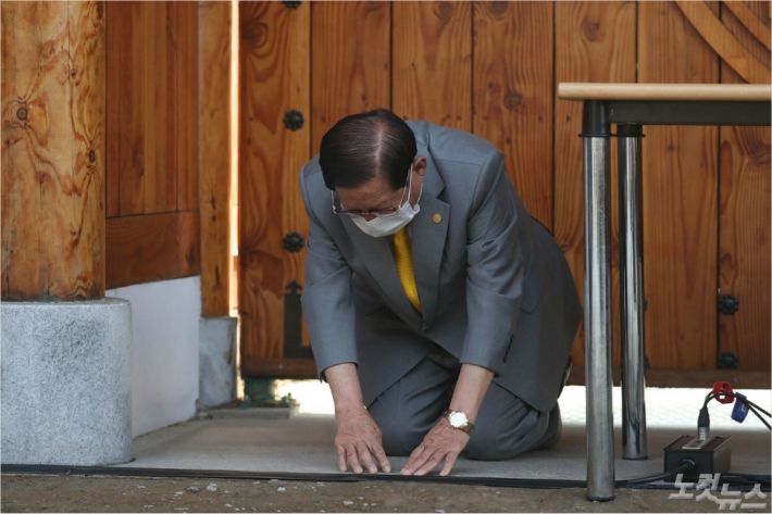 이단 신천지 이만희 교주가 2일 오후 경기도 가평군 청평면 고성리 평화연수원에서 코로나19 관련 기자회견 중 큰절을 하고 있다. (사진=이한형 기자/자료사진)