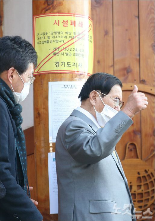 이단 신천지 이만희 교주가 2일 오후 경기도 가평군 청평면 고성리 평화연수원에서 코로나19 관련 기자회견을 마치고 엄지를 올리고 있다. (사진=이한형 기자/자료사진)