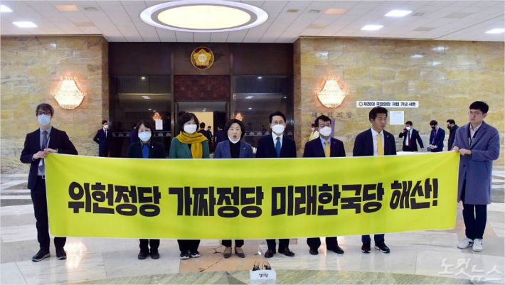 정의당 심상정 대표와 윤소하 원내대표 등 의원들이 3일 오후 국회 로텐더홀에서 '위헌정당, 가짜정당 미래한국당 해산' 촉구 기자회견을 하고 있다 윤창원기자