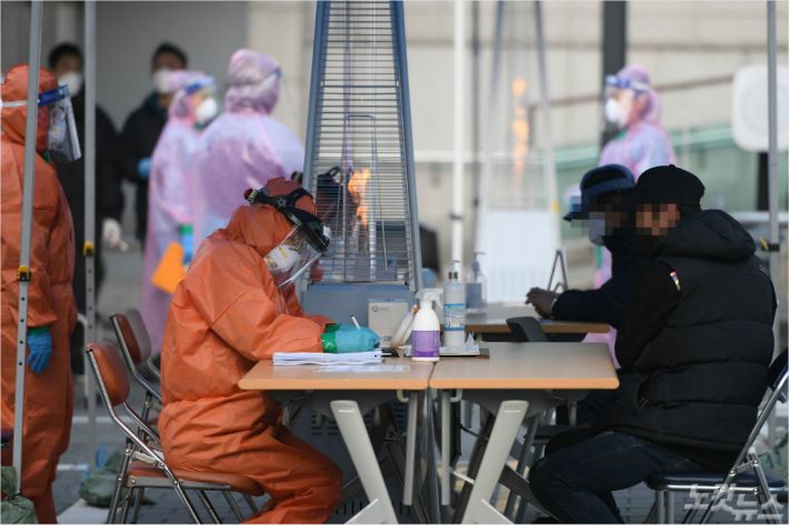 4일 오전 서울 은평구청에 마련된 선별진료소을 찾은 시민들이 코로나19 문진표를 작성하고 있다. (사진=이한형 기자)