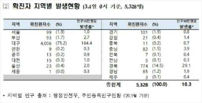 인구 10만 명당 확진자 발생률은 10.3을 기록해 처음으로 10명대에 진입했다. 지역별로는 △대구 164.4 △경북 29.1 △충남 3.9 △부산 2.7 △울산 2.0 △경남 1.9 △강원 1.4 △서울 1.0 △대전 1.0등을 기록했다.