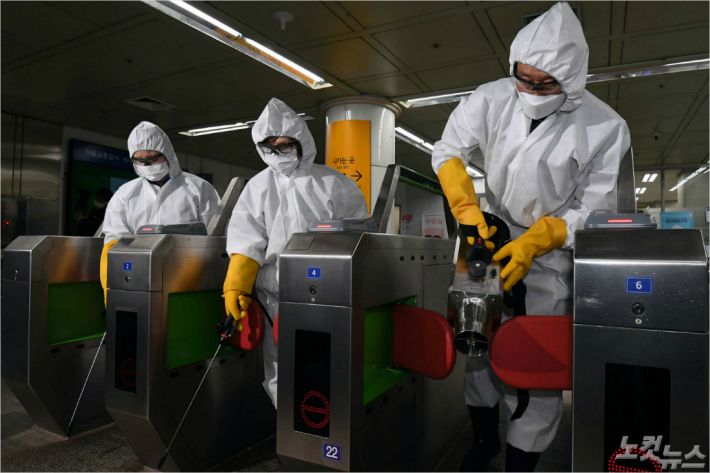 코로나19 확진자가 2천명을 넘어선 지난달 28일 오후 서울교통공사 관계자들이 광화문역에서 방역작업을 하고 있다. (사진=황진환 기자/자료사진)