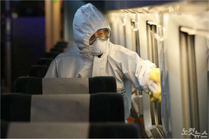 신종 코로나 바이러스(코로나19)의 확산이 지속되고 있는 가운데 4일 서울 용산구 서울역에서 방역작업자들이 정차된 KTX 내부 방역 소독을 하고 있다. (사진=박종민 기자)