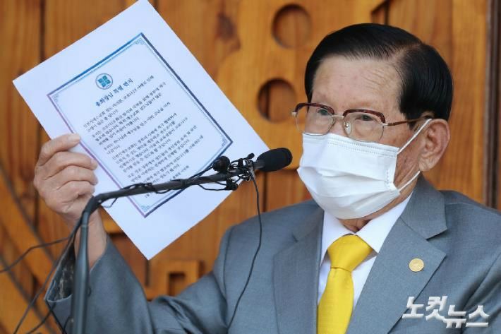 신천지 교주 이만희가 2일 오후 경기도 가평군 청평면 고성리 평화연수원에서 열린 코로나19 관련해 기자회견에서 발언을 하고 있다. (사진=이한형 기자/자료사진)