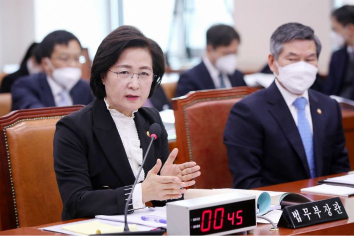 추미애 법무부 장관이 4일 오전 서울 여의도 국회에서 열린 법제사법위원회 전체회의에서 발언하고 있다.(사진=연합뉴스)