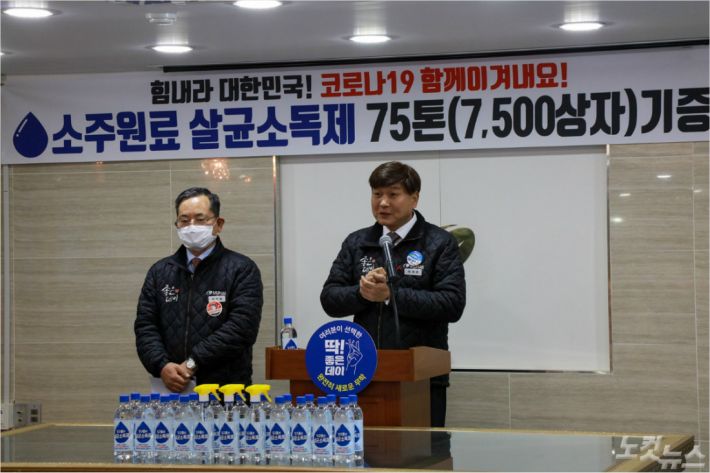 무학그룹 최재호 회장(사진 오른쪽)이 9일 소주 원료인 주정으로 만든 살균 세정제 기증 사업을 설명하고 있다 (사진 = 무학 제공)