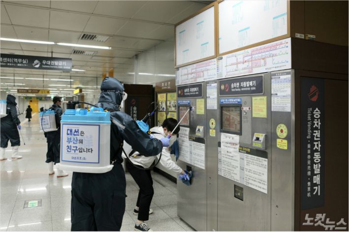 지난 9일 대선주조 임직원들이 부산 동래구 사직역에서 방역소독 활동을 하고 있다 (사진 = 대선주조 제공)
