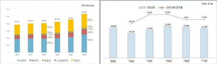 글로벌 농기계 시장 규모·전망(왼쪽)과 국내 농기계 시장 규모. (사진=한국기계연구원 제공)