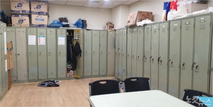 병원 청소 노동자들이 휴식을 취하는 휴게실. 여러 노동자가 한 공간에 모이지만 환풍기는 설치돼 있지 않다. 사진=CBS사회부 박하얀 기자