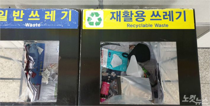 서울의 한 지하철 역사에 비치된 쓰레기통에 마스크들이 버려져 있다. 사진=CBS사회부 박하얀 기자
