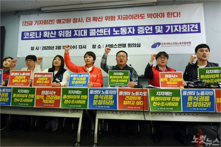 11일 오후 서울 서대문구 전국서비스산업노동조합연맹 회의실에서 열린 '코로나 확산 위험지대 콜센터 노동자 증언 및 기자회견' 참석자들이 구호를 외치고 있다