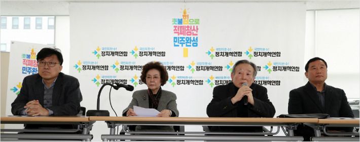 3월 10일 서울 종로구 운현하늘빌딩에서 열린 '정치개혁연합 창당일정 발표 및 선거연합정당 기조에 관한 기자회견'에서 조성우 공동창당준비위원장(오른쪽 두번째)이 발언하고 있다. 왼쪽부터 하승수 집행위원장, 신필균, 조성우, 류종열 공동창당준비위원장. (사진=연합뉴스)