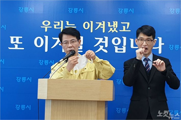 16일 오전 코로나19 브리핑에 나선 김한근 강릉시장. (사진=전영래 기자)