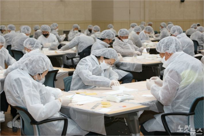 휴일도 반납하고 마스크 필터 분리작업을 하는 강릉시청 공무원들. (사진=강릉시청 제공)