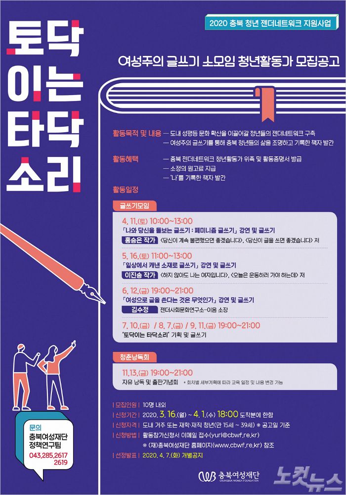충북여성재단이 '2020 충북 청년 젠더네트워크 지원사업'에 참여할 청년활동가를 다음달 1일까지 모집한다.