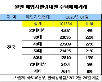 국토교통부와 한국감정원 통계자료에 따르면 올 1월 전국 주택매매거래는 총 10만1334건이다. 이중 40대가 2만7509건으로 가장 매입이 많았고 30대가 2만2035건, 50대가 2만1425건으로 뒤를 이었다.