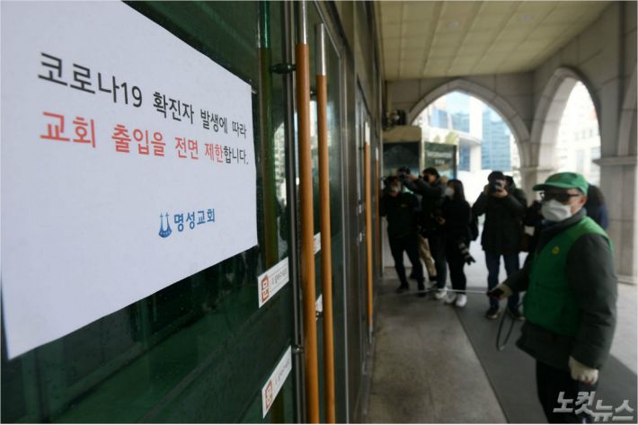 지난달 26일 오전 서울 강동구 명성교회 앞에서 관계자들이 코로나19 (신형 코로나바이러스 감염증) 전파를 막기 위해 소독을 하고 있다. 국대 대형교회 중 한 곳인 명성교회에서 부목사 등 2명이 코로나19 확진 판정을 받았다. (사진=이한형 기자/자료사진)