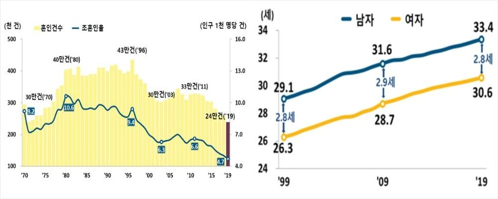 1970~2019 혼인 건수 및 조혼인율 추이(왼쪽)와 1999~2019 평균 초혼 연령(통계청 제공)
