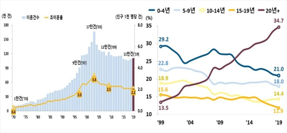 1970~2019 이혼 건수 및 조이혼율 추이(왼쪽)와 1999~2019 혼인 지속 기간별 이혼 구성비 추이(통계청 제공)