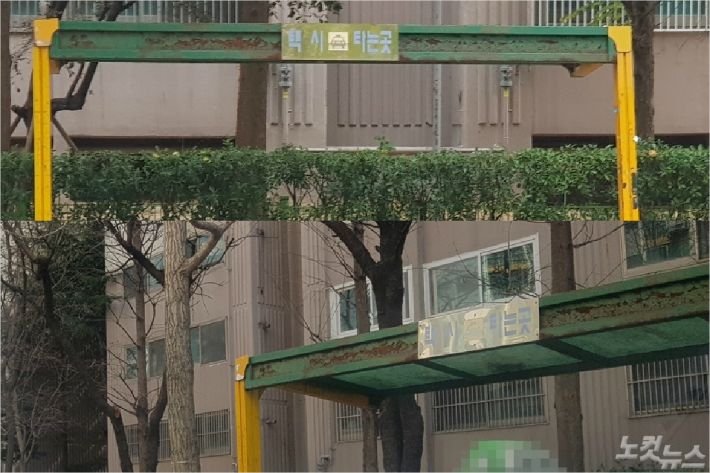 온 곳이 녹이 슬어 택시승강장인지 버스승강장인지 구분하지 어렵다. 천장은 당장이라도 떨어져 나갈 것처럼 덜렁거리고 가림막은 녹이 슬어 흉측한 모습이다.