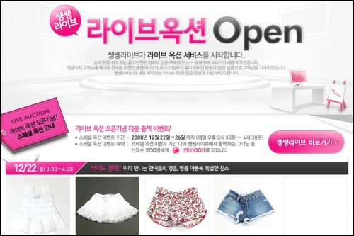 쌩쌩라이브는 오는 22일 오후 3시30분에 ''쌩쌩라이브 라이브 옥션'' 서비스를 본격 오픈하고 일주일 동안 라이브 옥션 특집 방송 및 이벤트를 진행할 계획이다.