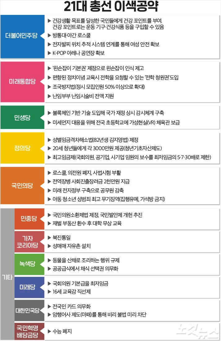 공약 경쟁없는 '깜깜이 선거'가 우려되는 4·15 총선에서도 유권자들의 눈길을 사로잡을 만한 재미있는 공약들이 적지 않다. 무거운 현안을 다룬 공약보다는 실생활에서 착안한 것들이 많아 치열한 선거 과정에서 '양념' 같은 존재다. 주로 군소정당들이 내세웠던 것을 지금은 거대 정당들도 속속 선보이고 있다.