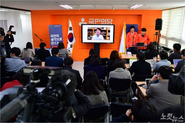 국민의당 안철수 대표가 지난 19일 서울 마포구 당사에서 화상으로 기자간담회를 갖고 있다. (안 대표는 대구 코로나19 의료봉사 활동을 마치고 자택에서 자가격리 중이다.) (사진=윤창원 기자/자료사진)